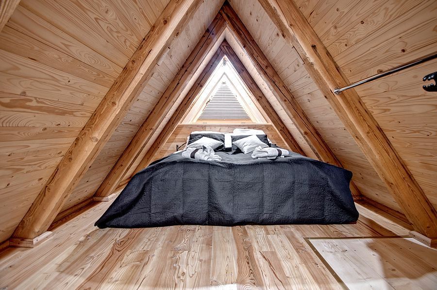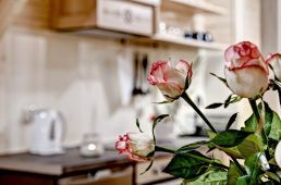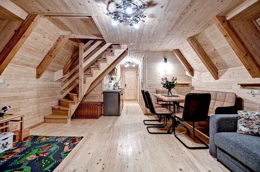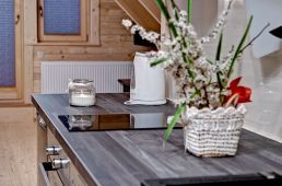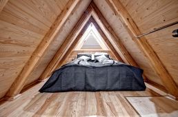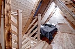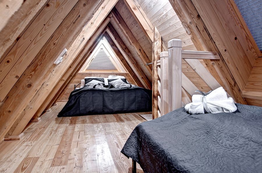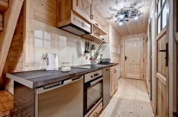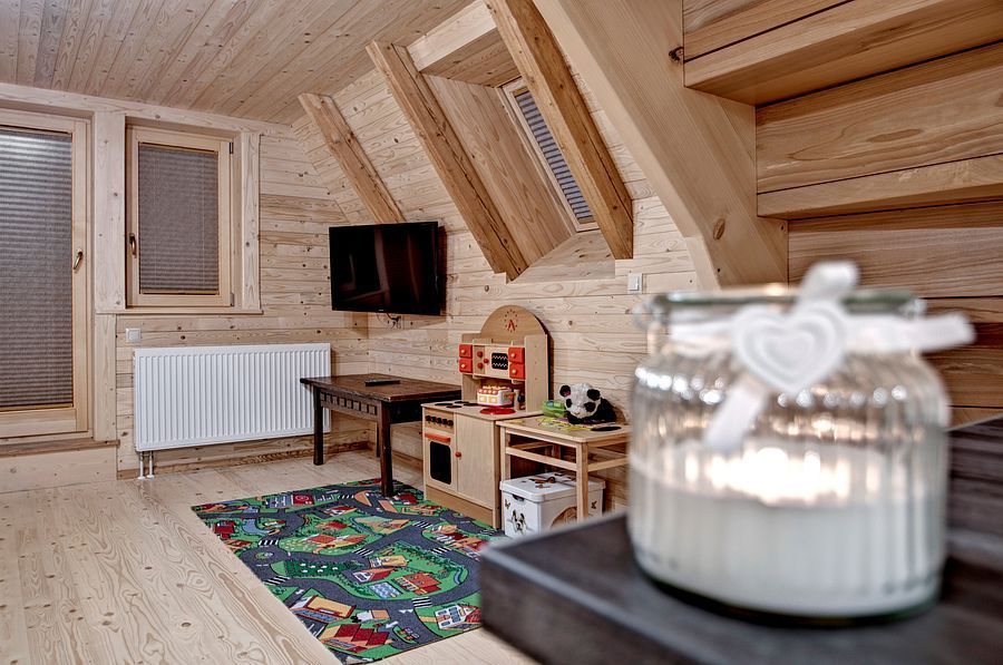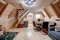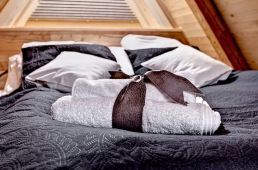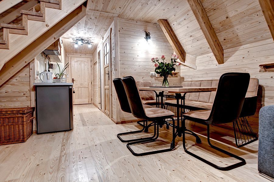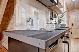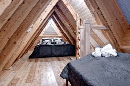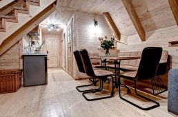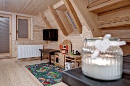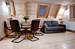 Jest to najmniejszy z apartamentów. Składa się on z antresoli w której są trzy łóżka pojedyncze oraz z salonu z w pełni wyposażoną kuchnią oraz rozkładaną kanapą. Położony na drugim piętrze. Jest w nim jedna łazienka. Proszę zwrócić uwagę, że jest w nim też duży skos.